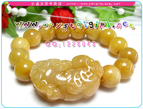 貔貅是避邪招财的灵兽。长期佩戴能和您心意相通,会保您仕途顺利,生意兴隆。是佩戴和送朋友的上好佳品。风水吉祥物—貔貅,貔貅是传说中的一种神兽,身无鳞,无毛,有翅,头生独角或双角,神态威武,凶猛异常;有趋财旺财的作用,这是较多人知道的,在一些麻雀馆,都很容易坎到《貔貅》。除偏财之外,对正财也有帮助,所以做生意的商人也安放貔貅在公司或家中。 黄玉古称“黄精”,英文Topaz一名系由Topazics变化而来,它是红海上的一个岛屿,可能是早期橄榄石的产地。因而,古名兼指黄色刚玉、黄水晶或黄玺。佛经中记载的黄玉石指现今的橄榄石。现今黄宝石专指矿物学中的黄玉(黄晶)宝石。它除了黄色外,也有蓝色、金黄色、红色等品种。它的工艺名称常称为“托帕斯”。 黄玉长期以来就是轻珍贵的宝石之一,据说佩戴它可作为护身符,能消除悲哀、增强智慧和勇气。 |