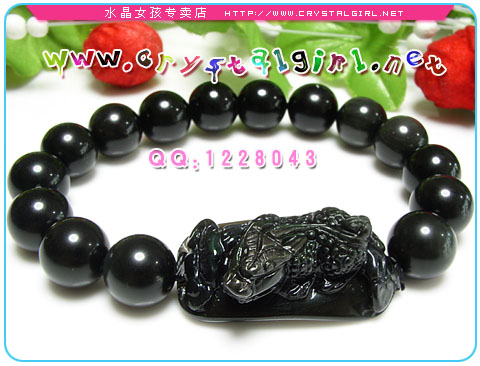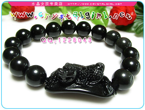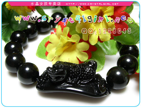 此款为黑曜石貔貅手链,貔貅身上有绿色的彩眼,前后雕有2块如意。可辟邪招财。寓意财源不断万事如意哦。 黑曜石(Obsidian)属于火成岩的一种,很多人都以为黑曜石并不属于水晶,但是黑曜的成分也是SiO2(二氧化硅)为主。黑曜石是火山溶岩迅速冷却后形成的一种天然玻璃,属于非纯晶质的水晶宝石。 黑曜石通常呈黑色,但是也可见棕色、灰色和少量的红色、蓝色甚至绿色。也有可能是全部单色、或有条纹、或有斑点,最有名的是有彩虹闪光的彩虹黑曜岩 Rainbow Obsidian,并且有些条文呈椭圆形状,就形成俗称的单眼黑曜或者是双眼黑曜石了,而如果以价格来看,彩虹单眼黑曜及彩虹双眼黑曜是价格最高的,因为除了产量较为稀少之外,品相也相当的漂亮。 黑曜的分布大多是曾有火山活动的地区,如美国的夏威夷、日本、印尼的爪哇岛,其它在冰岛、匈牙利、意大利的利帕里群岛、前苏联、墨西哥、厄瓜多和瓜地马拉等地也有出产。深黑色单眼的黑曜石则分布于美国的亚利桑那和新墨西哥州,被印第安人称为「阿帕契之泪」。 由于黑曜的精纯能量属于吸纳性能量,一般建议佩带右手为佳,所有的水晶几乎都是佩带左手,惟独黑曜,是可以佩带右手。因为根据古中国气法左进右出的原则,左手都是进气而右手是排气,右手佩带黑曜有助于将自身的负性能量给吸纳掉,包括比较不干净的东西或者病气,甚至是比较不好的运气都可以。但黑曜佩带左手或者右手都是可以的,这要看您想要哪一种能量属性为准。一般而言,如果您想要防止一些不好的负性能量,就可以佩带在左手,让不好的能量不会入侵。 黑曜石极度辟邪,能强力化解负能量,中国古代的佛教文物中,就有相当多有关于镇宅或避邪的黑曜石圣物或佛像。黑曜石也是现在供佛修持的最佳宝石。在水晶家族之中,黑曜也是排除负性能量最强的水晶之一。所以可以放在煞气较重的地方,甚至做成黑曜佛像,对于避邪档煞的效果更是上乘。 |