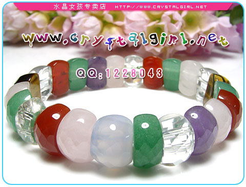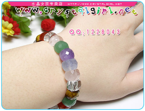 水晶女孩小贴士:由绿陵玉、粉晶、蓝玉髓、白晶、紫晶、红玛瑙、虎眼石组成的手环,带有多角度切面,让您与众不同. 绿陵玉:代表财富之光,能在聚集财富的同时,也能吸引好朋友相伴,贵人提携相助。借助东陵玉的能量来打开心轮,可稳定不安的情绪,使得人们天天开心,时常快乐。绿东陵犹如春天的能量,欣欣向荣、丰盛、富足、美好,并充满希望、干劲。 紫水晶、玛瑙:代表财富之光,能在聚集财富的同时,也能吸引好朋友相伴,贵人提携相助。可以美容养颜! 白水晶:可以帮你提升思维,集中精神,将能量传达出去及导引进来的功效,有助心灵感应,令你梦境成真。而且可以辟邪保平安,可以防止辐射。 粉水晶:又称芙蓉粉晶、玫瑰晶,如春日桃花,可增加人缘哦,可助你的爱情一帆风顺。而且可以美容养颜。 虎眼石:能发挥如王者的力量,令事件容易达成协议,名成利就,有避邪招财及聚财的作用。能激发勇气,带来信心使人勇敢的宝石;做事能贯彻始终,做人能坚守原则;亦可加强肉体生命力,适合体弱多病、或刚痊愈的人配戴。 蓝玉髓:蓝玉髓对于於喉咙附近的器官有帮助,如气管、肺部、甲状腺体等,因此可提高这方面的免疫能力。另外還有可減少疼痛及促进孕婦哺乳的功效。 |