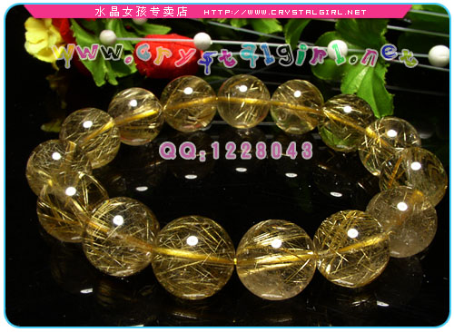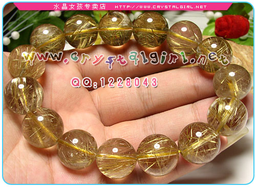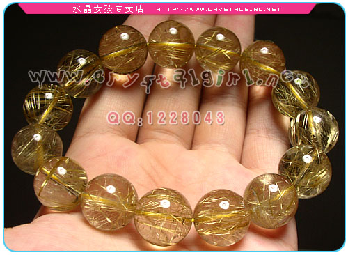 小贴士:此款钛晶是发是属于相对细些的,但是发多,金光产足,颗颗饱满。在阳光下闪闪耀眼,会感到心旷神怡,爱不释手。喜欢不要错过哦! 钛晶也是发晶族群之一,特征是含针状金属之矿物质內含物,目前产地巴西北部的巴依亚州由于产量稀少,已停产惜售,是现今最珍貴的水晶类宝石。钛晶也是发晶族群里能量最为强大的,常象征大吉祥、富贵、如神佛加持。一般钛晶皆具有六大主能量,主财、偏财、人缘、避邪、健康、防小人。质优的钛晶也一直是水晶收藏玩家即欲收藏的至宝! 钛晶 Quartz Rutilated 化学式 SiO2 晶系 六方晶系