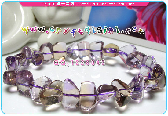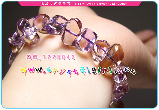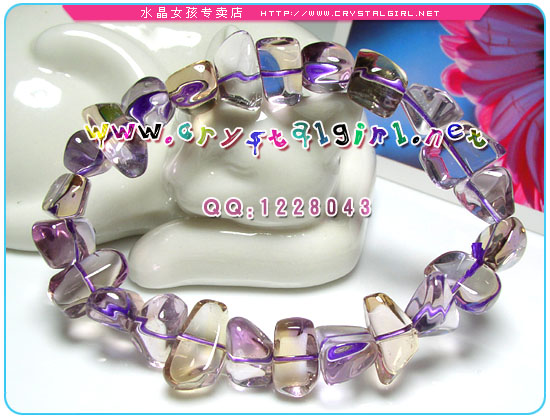 水晶女孩说明:绝对AAA+品质,超级通透! 黃色色光對應太陽輪,可幫助腸胃等消化器官, 對胃,十二指腸,肝,膽,胰臟,甚至皮膚,橫隔膜(呼吸系統)都有助益。兼具黃晶與紫晶的功能:既可招來偏財運,又可守財開智慧,據說由於兩個顏色同時存在再一顆晶石上,因此也意味著可增加佩帶者的包容度,處於複雜不友善的人際關係及環境中時,可以從容自在的協調排解周圍的糾葛。 紫黄晶兼具黄水晶与紫水晶的功能,既可招来偏财运,又可守财、增强运气、改善人际关系与开发智慧两种颜色同时存在于同一颗晶石上也是相当不易的,能协调人际关系。可帮助肠胃等消化器官,对于头痛、偏头痛等症状也有舒缓的效果。 紫晶被西方人奉为“诚实之石”,它象征着诚挚、正直与善良,也象征天真与快乐。而西方人将黄晶誉为“友谊之石”,代表真诚和挚着的爱,意味美貌和聪颖;象征富态、有生气,能消除疲劳,能控制情绪,有助重建信心和人生目标。