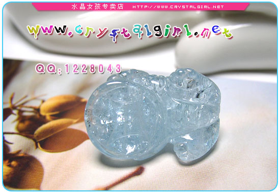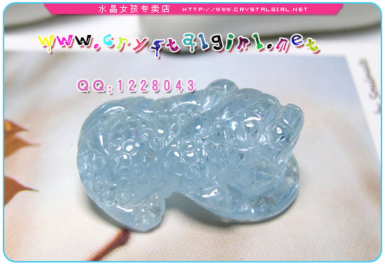 水晶密语:很蓝的海蓝貔貅吊坠!海蓝宝的雕件非常稀少,此款为海蓝中的上品。招财必备! 特质:美美的海蓝宝矿石,充满浪漫的海洋风味!但真正的海蓝宝品相好的并不多,如此通透正蓝的海蓝实属少见,赶快收藏它吧^^ 生理作用:蓝色对应喉轮,有助于加强沟通及表达能力,对附近之喉咙,气管,甲状腺等器官极腺体具疗效 ,适合佩带在喉咙周围。 心理作用:常用海蓝宝作冥想,与形而上的力量可达到某种程度的沟通,因而对时间及空间运用都能掌握,是一种象征爱与和平的宝石。海蓝宝又叫"海水蓝晶"被称作"享福之石"代表水之纯净的海蓝宝被作为护身符,海蓝宝有着呵护爱情的神奇的力量。 海蓝宝:含地、水、火、风四大元素,具强大的治疗、净化、灵通力量,是最具疗效的水晶。强化下半身功能,净化人体气场,对筋骨、肾脏及头痛有助益。可加强对事物的理解及重点的掌握。 「海蓝宝」是一种非常珍贵的宝石,能帮助个人的表达能力、语言能力、领悟力和喉部健康及平衡淋巴系统的操作等。好处非常之多。更适合一些要使用语言、谈话、声线等的行业。例如教师和推销员等。海蓝宝是西历三月份的生辰幸运石。相传在幽深的海底,蕴藏着海水澎湃的蓝宝石被美人鱼所珍藏,除了装点她们的容颜外,一旦阳光照射便会散发出其神秘力量,这种宝石从海洋中汲取美丽的容颜,海洋之神以她作为礼物送给小美人鱼,从此之后,海蓝宝石给拥有她的人带去了爱的力量,正因为拥有生命之水的蓝色,海蓝宝石象征着春天的开始,被视为三月的生辰石海蓝宝石外表晶莹剔透、纯净无暇,在各种光线下都能散发耀眼的光彩,且纯且美。 双鱼座、双子座、天蝎座、射手座的朋友都非常适合戴海蓝宝石,它可以改善呼吸道及咽喉等部位 |