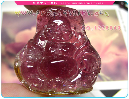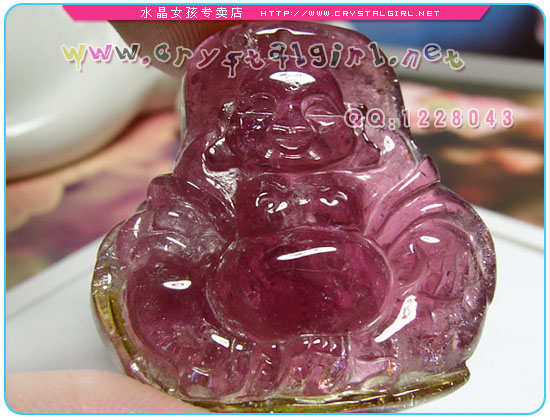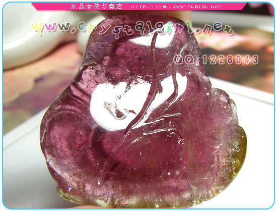 水晶女孩小贴士:精致可人的笑口佛坠,奇特的西瓜特性。在灯光下呈高贵的紫红色,质感油润。有一定的冰裂和绵体,个头不小戴起来非常大气。配本店自制石榴项链效果更佳。