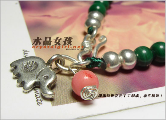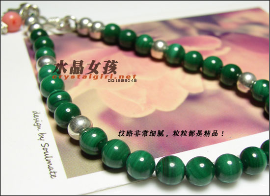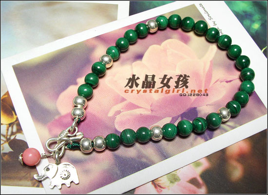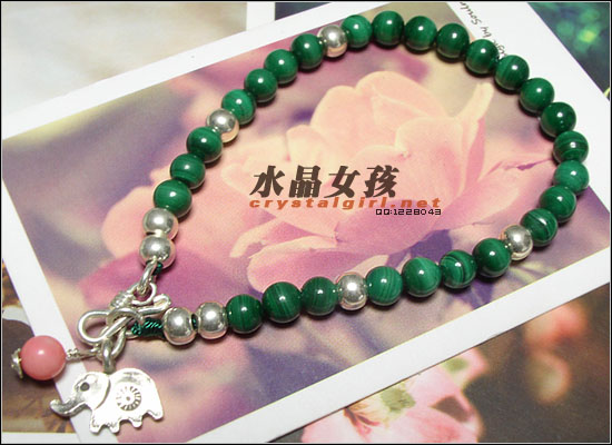 水晶女孩密语:本款由99纯银小象,银扣,925银珠,珊瑚(本款为天然白珊瑚染制成粉色,天然的珊瑚通常带有虫蛀孔现象),AAA级孔雀石制成,非常精致。 孔雀石即是因其颜色像孔雀羽毛般翠绿而得名。等级很高的孔雀石,鲜艳的微绿色,纹路清晰。有丝绢光泽。 没有两块一样的孔雀石——这种充满了纹理的石头就是有这种好处,让你没有撞款的担心。就算是同一条孔雀石内每一粒珠的纹路都是不一样的。判断孔雀石品质的依据主要就是它的颜色和纹理。纹理越细腻,清楚,颜色越鲜艳,品质越上乘。 孔雀石一是种脆弱但漂亮的石头,有“妻子幸福”的寓意。绿是最正、孔雀石制品 最浓的绿。绿的孔雀石,有种独一无二的高雅气质。 孔雀石功效:可以帮助人净化启动人体的轮脉,特别是心轮及喉轮,尤其对安抚情绪及释放负面的能量有特别显着的功效,也可帮助治疗失序的身心灵。孔雀石可产生能量,有保护,生意成功,爱,和平与安定的作用,并有示警的功用,据说当有危险即将发生时,就会破裂警告它的主人,孔雀石对小孩及旅行者有护身的作用,可趋吉避凶。 天然孔雀石的保养:需要注意的是漂亮的孔雀石跟红珊瑚、砗磲一样都是怕酸的,就是人体出汗后,佩戴一段时间光泽差些,不过据说用bb油擦拭可以改善恢复。在洗澡或其他与酸碱性有关物质接触时,首先将孔雀石饰品取下收藏好。孔雀石韧性差,脆性强,怕碰撞,易碎,因此佩戴时应避免与其他硬度较大的物体接触,以防止碰撞或磨擦造成局部的破损及光泽损伤。佩戴过程中,应给予适当的保养,经常用细绒布或羊皮擦拭,可保持孔雀石持久光泽。 |