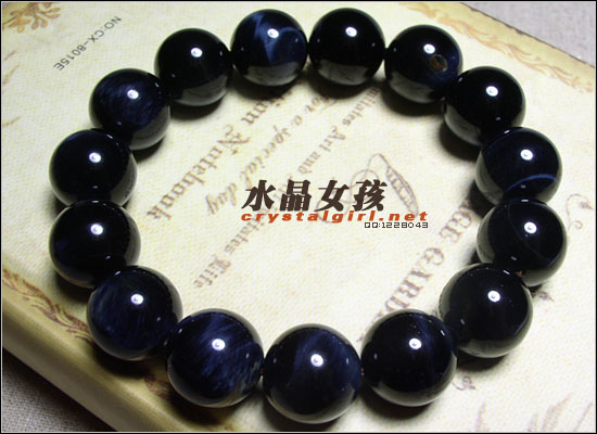 水晶女孩说明:质地相当不错的蓝色虎眼石,每棵珠子均闪烁着如老虎眼般的蓝纹光泽,给您带来勇气、魄力、信心和持之以恒气质,增强胆量与活力。 一般为黑黄相间的色调,像老虎的纹路,此款是较少见呈现的出蓝黑色,称为蓝色虎眼石,其能量强大、刚烈,对应太阳轮、脐轮。