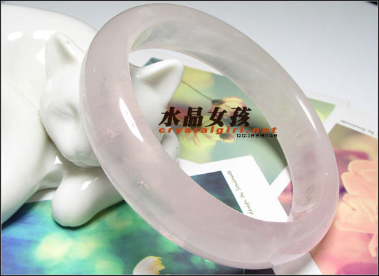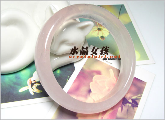 水晶女孩密语:非常厚实的一款粉晶手镯,星光冰种的原料,少绵,有大块的猫眼效果。色泽粉润,非常惹人爱。本款已经属于高品质等级,有处细小的矿缺对与这么大的用料来说已经相当完美。买过水晶的MM都知道,矿缺绵体都是天然的标志,和人一样,喜欢它就要接受它的缺点,人无完人,更何况出自亿万年前的水晶呢。对于刚喜爱水晶又不了解的朋友,特此说明:) 粉晶特性:美丽的粉红色色泽,惹人怜爱!一般含些许天然白色云纹,其色泽乃是因为含钛与锰的缘故;原矿为块状,市面上的粉晶晶柱皆为后来人工琢磨而成。透明的粉晶不常见,其中金红石内涵勿在切磨成凸面形时,向著单一光源可能会产生六线星芒效果,人称“星光粉晶”。 注意事项: