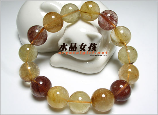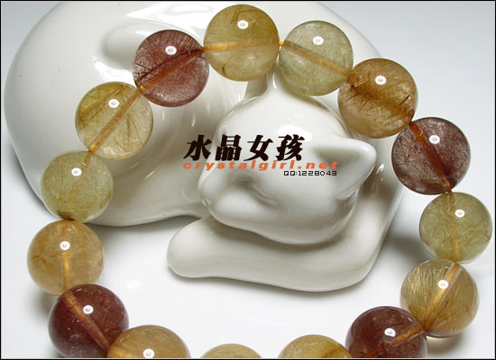 | 水晶女孩小贴士:本款为大彩发手链,含金色发晶、红发晶。由于发晶的不同颜色,可发出不同的光能,红黄发能提高身心健康和带来财富。 发晶磁场能量较强,可增强胆识,加强一个人的信心及果断力,能带给人勇气,可助人投射出权威的能量,有助于领导人命令的贯彻与执行。由于发晶的不同颜色,可发出不同的光能,每根发丝带动水晶本身的能量加倍运作,能使人百脉皆通,启发内视潜能,提高身心健康和灵性.发晶还能够给人带来刚毅果断,勇往直前,坚忍不拔的能量,加强一个人的信念及自信心。 金发晶:水晶中内含二氧化钛金属,是发晶族中最极品的水晶,是发晶之王,是公司行号决策者最佳佩带的天然力量宝石。可增加能量聚集,象征尊贵、权力与财富,招偏财亦聚正财,带来意想不到的鸿运。也可助气、强身。 红发晶、褐发晶:改善气血不调,使人青春活力,热情有魄力,用于辟邪、亦可清除恐惧、疑虑、优柔寡断及意志消沉。 |