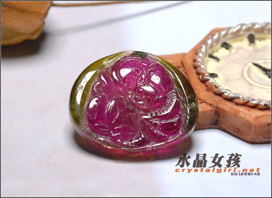 水晶女孩小贴士:红色的肉,绿色的皮,非常正宗的西瓜碧玺!色彩艳丽,像极了儿时吃的彩色糖果。雕有蝙蝠、铜钱和寿桃,寓意福禄寿临门!