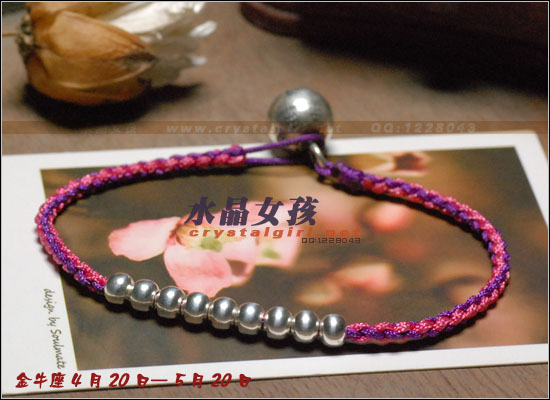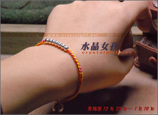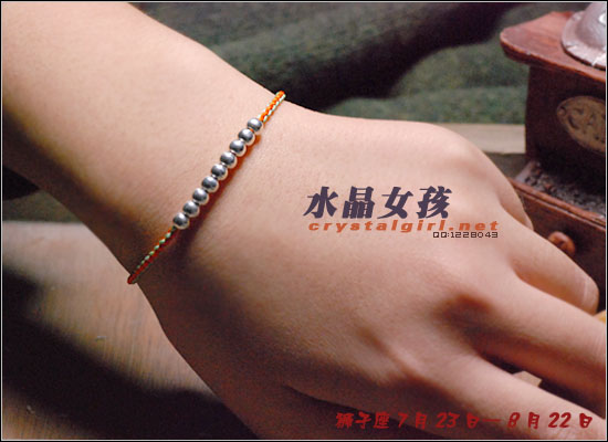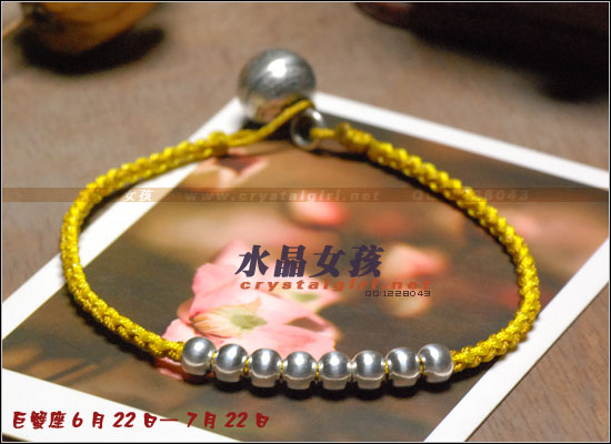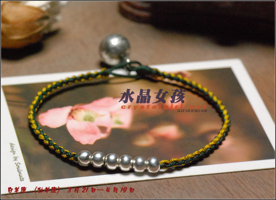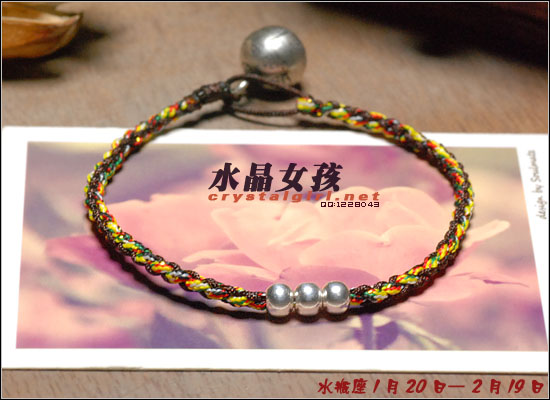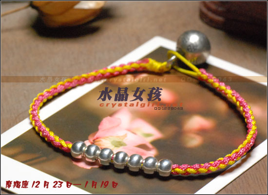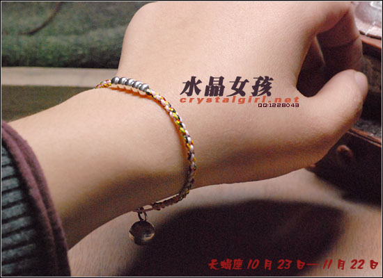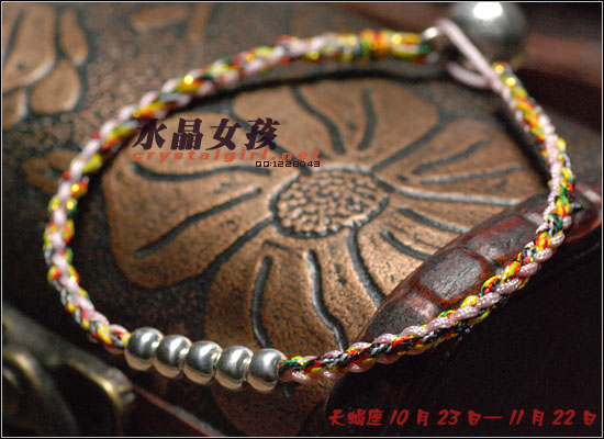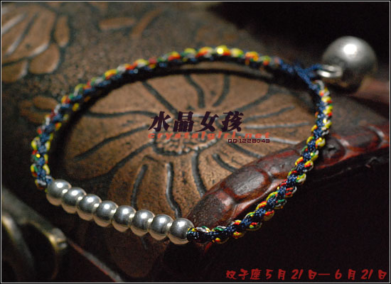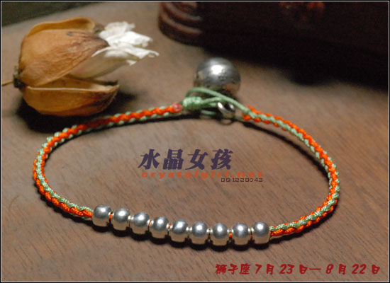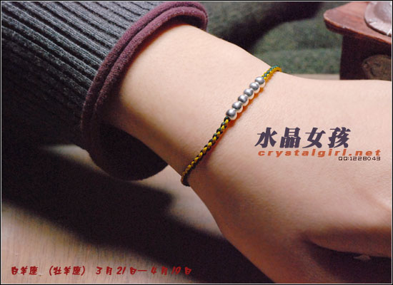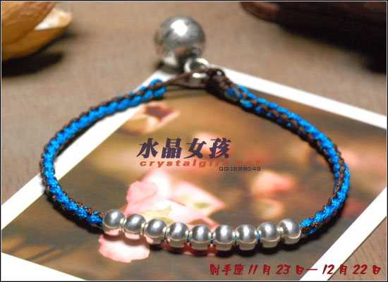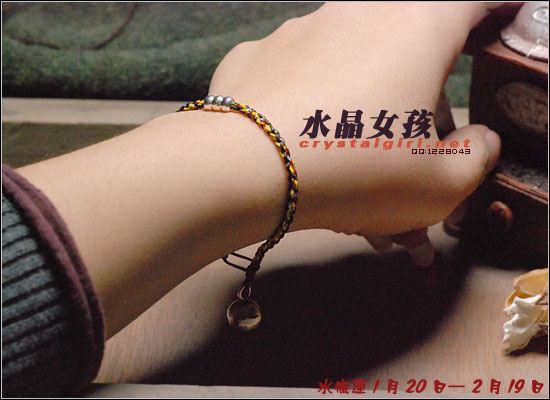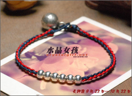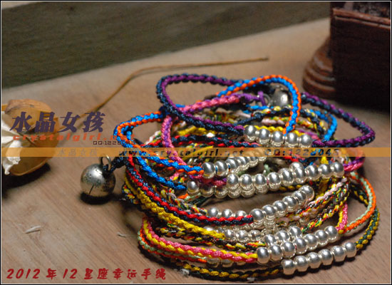 水晶女孩原创2012年星座幸运手链,配合2012年星座幸运色和幸运数字,幸福99泰银手工铃铛收尾,2012年好运多多!! 射手座——人本来就很喜欢自由、无拘无束的生活日子。如果使用海水蓝的佩戴物品的话,可以让射手座人更加地有安全感。而如果佩戴咖啡色的佩戴物品的话,因为咖啡色本就是比较朴实的颜色,如果让其射手座人佩戴的话,肯定能够很好地把射手座人的注意力给集中在一起,让他可以更好地做好自己本份的工作,取得更好更大的成就。幸运数字:9 摩羯座——可以佩戴的幸运颜色为桃红色和黄色。如果摩羯座人选用桃红色佩戴事物的话没那么可/以让自己变得活力四射的,不要哪个时候看他都显得那么死气沉沉的,让人觉得一点生气都没有。而如果选用黄色佩戴物品的话,除了好看之外,还可以安抚自己的身心,让自己不用再那么地急躁。幸运数字:7 巨蟹座——佩戴的幸运颜色为黄色。本来黄色就是维护和谐的一种颜色,所以如果巨蟹座人能够佩戴其颜色的话,肯定能够让巨蟹座的人花上更多地时间在其生活上,让自己的生活可以过得更加地多姿多彩。幸运数字:8 金牛座——能够佩戴的幸运颜色有紫色和桃红色。本来金牛座人是个个性比较倔强的人,如果可以佩戴桃红色的话,一定可以更加地增进金牛座人在行动上的积极能力,让其能够在事业有更大的发展机会。而如果佩戴紫色的话,那么就可以让自己的心灵得到成长,不用再那么地劳累了。幸运数字:9 白羊座——绿色是白羊座人最幸运的颜色, 因为绿色如果搭配上金色的话,可以让人感觉更加地有安全感。幸运数字:6 处女座——处女座人,最适合他们戴的幸运颜色为水蓝色和橘色这两种。如果让处女座人佩戴橘色的话,可以让处女座的你放下沉重的负担,让自己不要每天都那么地劳累,也可以和其他上班族一样轻轻松松地工作。而如果佩戴水蓝色的话,那么就可以 让处女座的人创造出更多地只属于自己的风格事情来。幸运数字:8 狮子座——狮子座人天生就有一股领导人的能力,他们在做事上的作风特别地高调,如果可以佩戴橘色或是苹果绿颜色的物品的话,那么可以让狮子座的你变得更加地谦逊,让你在与家人或是朋友相处地时候,会显得特别地亲切,不会因为太拘谨而不知道该如何更好地去与他们相处。幸运数字:9 天蝎座——天蝎座人佩戴的幸运颜色为粉橘色或是粉红色。配以五色能量平衡线。。因为天蝎座人的自主意识特别地 强烈,所以可以佩戴点粉橘色或是粉红色的颜色来分散其注意力,让自己的神经可以得到缓解,不用时刻都紧绷绷的,感觉很不舒服。幸运数字:5 天秤座——人可以佩戴的幸运颜色为红色或是深蓝色。如果可以给天秤座人佩戴一些红色的佩戴物品的话那么就一定可以使天秤座人更具有一点活泼的气氛,再加上一点深蓝色的佩戴物品的话,就会把天秤座人的脚步更加地加快一点,让他们可以更快地做出正确的判断能力,可以更快地获得成功。幸运数字:6 水瓶座——水瓶座人可以佩戴的幸运颜色为咖啡色。配以五色能量平衡线。水瓶座人很喜欢自由的生活,所以如果佩戴了咖啡色颜色的东西的话,会让水瓶座的人变得更加地成熟稳重,在做事情的时候也会因为此特点而更容易地获得事业上的成功。幸运数字:3 双子座——双子座人佩戴的幸运颜色为蓝色。配以五色能量平衡线本来双子座人的性格就是那种聪明伶俐,活泼开朗的人,再加上他们对任何事物的好奇心很重,如果能够佩戴年点蓝色配饰物品的话,就一定能够让双子座人在处理事情的时候,不会失去了原有该有的稳重之感。幸运数字:8 双鱼座——双鱼座人佩戴的幸运颜色有蓝绿色或是蓝紫色。双鱼座人最大的特质就是爱幻想、爱做梦,他们的恼火中总是幻想着很多地浪漫之事。如果给人佩戴了蓝绿色的话,可以让双鱼座的人变得更加地稳重一点,稍微再加上一点蓝紫色的话,就会把双鱼座人的情绪安抚得更加地稳定,做起事来也会更加地顺畅。幸运数字:5 |
