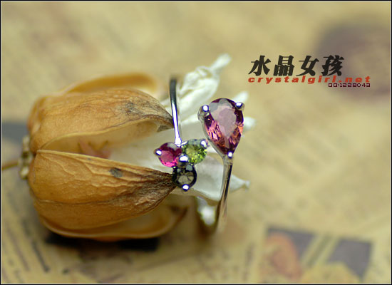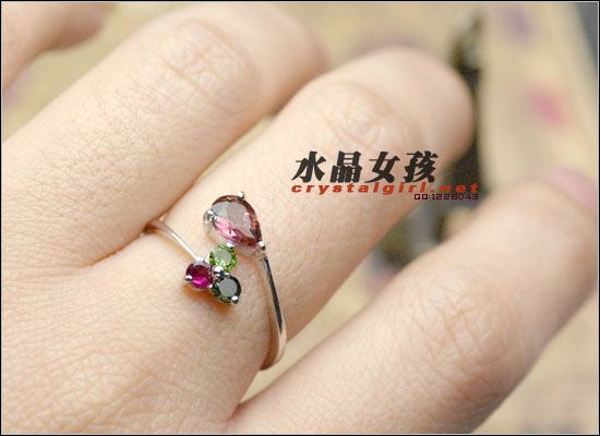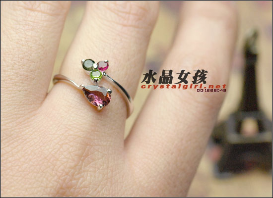 玫紫红,湖水绿,蓝宝组成的三叶草碧玺戒指。颜色艳丽,透明清澈,反火好,内部极为纯净,本款的指圈是可以伸缩的,所以对手指围基本上没有限制。款式别致新颖不要错过哦!
